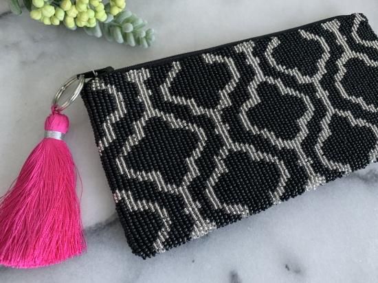 NINAのシグネチャーとも言えるモロッコの伝統的な建築模様を模したモロッカン柄。柄自体はとてもシンプルで決して派手ではないのに、パッと目を引くモダンな印象です。 こちらのお財布ポーチはお札は折らずに収納したいけどあまり大きな長財布はちょっと…というスッキリ長財布派にぜひおすすめしたい商品。カードポケットにカードを、仕切りの真ん中部分に硬貨を、両サイドにはお札やレシートを収納いただけます。小銭を入れる部分はファスナーがなくてもお金が飛び出ないような設計になっており、仕切りも少し固さを持たせてますのでお使いいただきやすいです。手のひらにしっくりおさまって持ちやすく、これだけ持ってちょっとそこまで行く時もスマートです。 ★完売の場合はご注文承ります メニューの「お問い合わせ」よりご連絡ください Inspired by Moroccan architecture, this beautiful design is the proud signature of NINA. Used as a popular alternative to full-length wallets, the zippered wallet pouch comes with an inner compartment for coins, a card pocket and just enough slot to keep unfolded notes. It holds comfortably into the grip of your palm, and makes your ordinary shopping route exciting! For questions or to place your orders, contact us at ninabeadedbags@gmail.com. 【商品詳細】 •ビーズの色:ベース/マットブラック、ライン/シルバー •内布の色:フューシャピンク •タッセルの色:フューシャピンク •サイズ(縦横実寸):約10cm×20cm •内部の仕様:カードサイズのポケット1、仕切り2 •エクストラビーズ付属 【注意事項】 ■国内郵便(レターパック/ゆうパック)もしくは国際郵便による追跡有りの安心発送です。国内に在庫がある場合のみ国内郵便にて約5日、在庫がない場合はシンガポールから国際郵便にて約7-10日程度で到着予定です。交通事情により前後する場合がございますのでご了承ください ■高品質のガラスビーズ使用 ■100%シルクの布地に縫いつけているため、デリケートな商品です。雨の日のご使用は避けていただく事をおすすめします ■ほぼすべての工程をハンドメイドでお作りしているためサイズに多少の誤差が生じることがございます。極端に神経質な方はご遠慮ください